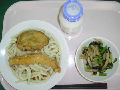 今日の給食 公開日 2012/09/28 更新日 2012/09/28 その他の教育活動 今日はコシのある冷たいうどんでした。大きめのえびの天ぷらがのっていて、高級感がありました。(9月27日) 《今日の食材産地》 たまねぎ:北海道 にんじん:北海道 じゃがいも北海道 カットさつまいも:千葉県 きゅうり:群馬県 小松菜:埼玉県 白菜:長野県 キャベツ:群馬県 鶏がら:青森県 りんご:岩手県 ブラックタイガー:ベトナム カットしめじ:長野県