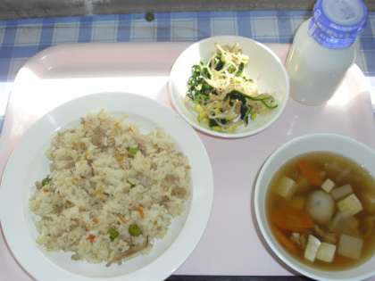 今日は、あっさりした和食の給食でした。ごま和えは、大豆もやしの黄色い部分が彩りのアクセントになっていました。(10月2日)