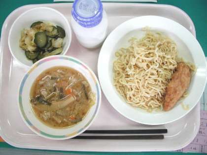 今日の給食 公開日 2012/10/04 更新日 2012/10/04 その他の教育活動 今日はたくさんの麺がありました。みんなおかわりを楽しんでいました。(10月3日) 《今日の食材産地》 にんじん:北海道 きゅうり:群馬県 はくさい:長野県 チンゲンサイ:千葉県 もやし:神奈川県 ねぎ:世田谷育ち 山形県 キャベツ:群馬県 鶏がら:青森県 豚もも:沖縄県 鶏もも:沖縄県 鶏ささみ:青森県
