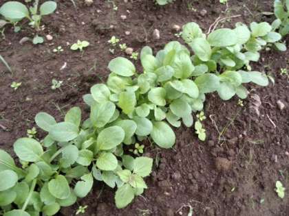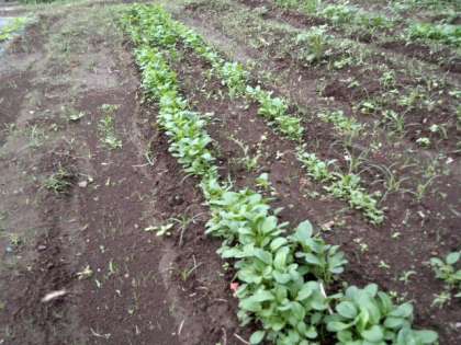 小松菜が元気に育ち、みんなで間引きを行います。(10月10日)