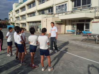 チームごとにバトンの受け渡しを練習しました。(10月10日)