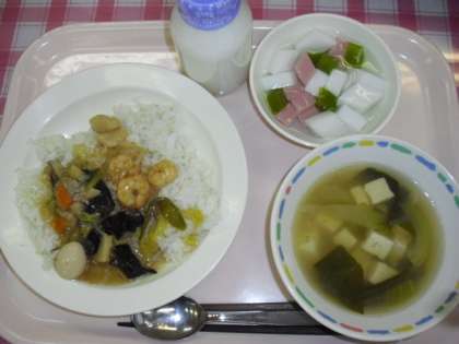 今日の給食 公開日 2012/11/02 更新日 2012/11/02 その他の教育活動 今日は具だくさんの中華丼でした。ご飯には、ビタミンや食物繊維が豊富な「大麦」も入っていました。(11月2日) 《今日の食材産地》 たまねぎ:北海道 にんじん:北海道 ごぼう:青森県 白菜:長野県 ねぎ:せたがやそだち チンゲンサイ:茨城県 豚もも:宮崎県 鶏がら:青森県 かじきまぐろ:静岡県 いか:青森県 りんご:青森県