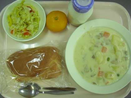 今日は、洋食の献立でした。パンにはダイスカットのチーズがごろごろ入っていて、食べ応えがありました。(11月7日)