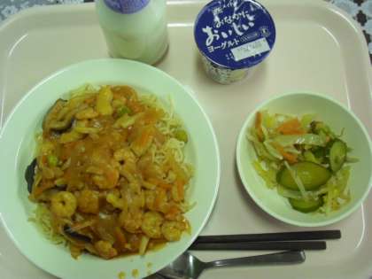 今日は、蒸した中華めんにエビのチリソースがかかった斬新な給食でした。チリソースは量が多めだったので、たっぷりかけられました。(11月9日)