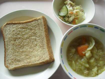 今日のパンは、給食では珍しい「胚芽パン」でした。はちみつとバターがぬってある、甘くておいしいパンでした。色のせいか、「シナモンの味がする!」と言っている子が何人かいました。(11月19日)