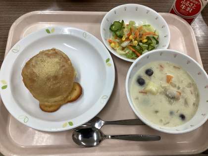12月4日の給食 公開日 2024/12/04 更新日 2024/12/04 給食 (今日の献立) ・ビスキーパン ・クラムチャウダー ・コールスローサラダ ・牛乳 ビスキーパンは、丸いパンの上にビスケット生地をのせて焼いた、メロンパンのような甘いパンです。パンのなかには、いちごジャムも入っていて、特別な気分ですね!
