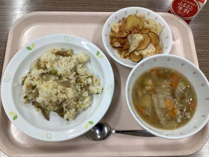 12月12日の給食 公開日 2024/12/12 更新日 2024/12/12 給食 (今日の献立) ・鶏ごぼうピラフ ・白いんげんの田舎風スープ ・野菜チップス ・牛乳 リクエスト給食2日目の今日は、副菜部門第1位「野菜チップス」を出しました!じゃがいも、さつまいも、れんこんを使い、パリッとなるよう高温で揚げています。今日もおかわりじゃんけんが盛況でした!