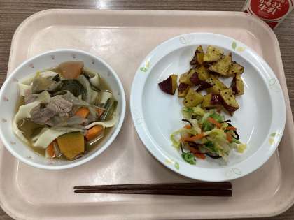 12月20日の給食 公開日 2024/12/20 更新日 2024/12/20 給食 (今日の献立) ・ほうとう ・白菜のゆず風味 ・じゃこ入り大学いも ・牛乳 明日の冬至に合わせて、かぼちゃとゆずを使った給食を作りました。具だくさんのほうとうで、冷えた体も温まりますね。