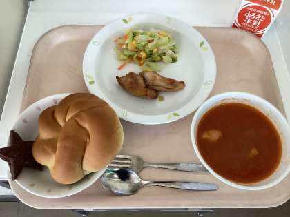 2学期最後の給食です。リースの形をしたパンやお星さまの形をしたマカロニ入りのスープ、星型のクッキーなど、今日は特別なメニューにしました!子どもたちがとても喜んでくれ、給食室も頑張った甲斐がありました。