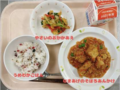 1月23日(木)の給食 公開日 2025/01/24 更新日 2025/01/24 給食 (献立) ・梅わかごはん ・生揚げのそぼろあんかけ ・野菜のおかかあえ ・牛乳 今日は、梅わかごはんでした。 梅の酸味が感じられ、梅干しが苦手な子も食べやすい様子が見られました。