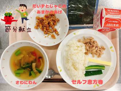 2月3日(月)の給食 公開日 2025/02/03 更新日 2025/02/03 給食 (献立) セルフ恵方巻 大豆とじゃこの甘辛揚げ さわにわん 牛乳 今日は節分献立として、セルフ恵方巻を出しました。 海苔の上にご飯をのせて、好きな具を入れて上手に巻いていました。 子供達が自分で作ったオリジナルの海苔巻ができて、とても楽しそうで良かったです。