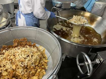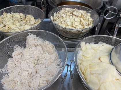 今日の野菜チップスは、さつまいも、ジャガイモ、レンコンを薄くスライスしてパリパリに揚げました。野菜によって水分量などの性質が異なるため、一度に揚げる量や時間を変えています。