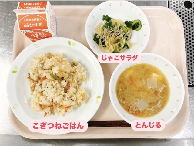 2月18日(火)の給食 公開日 2025/02/21 更新日 2025/02/21 給食 (献立)・こぎつねご飯・じゃこサラダ・豚汁豚汁には、白みそと赤みその2種類の味噌を使っています。赤みそは、長い時間熟成させて着色が進んだもの、白みそは熟成時間が短い淡いみそです。2つのみそがバランスよく合わさった豚汁を作りました。 給食