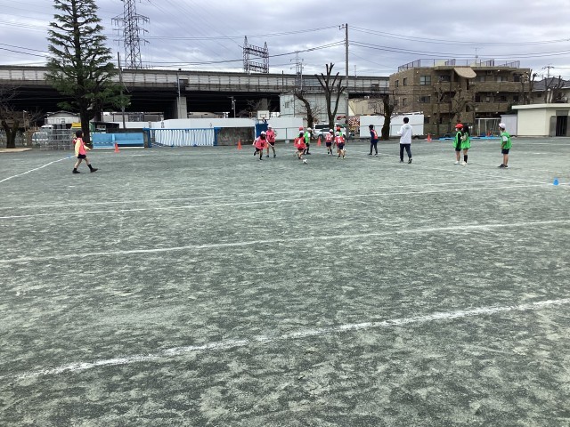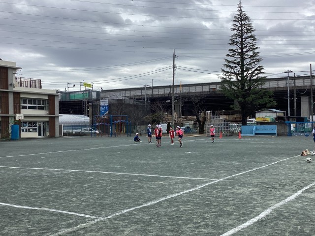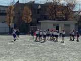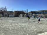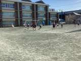 シュートしたボールが校舎の壁にゴンと当たったりしてましたが、うまくゴールを決めている児童もいました。