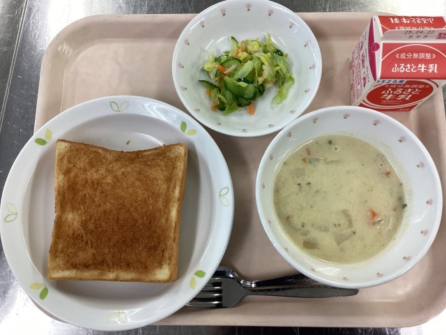 4月11日の給食 公開日 2025/04/21 更新日 2025/04/21 給食 【今日の献立】・シナモントースト・コーンチャウダー・フレンチサラダ・牛乳【使用した食材の主な産地】たまねぎ/北海道 じゃがいも/北海道 にんじん/徳島 パセリ/茨城 キャベツ/神奈川 きゅうり/高知 給食