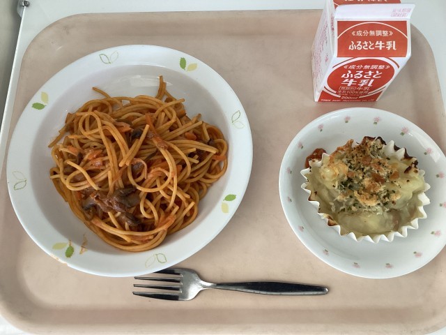 4月16日の給食 公開日 2025/04/21 更新日 2025/04/21 給食 【今日の献立】・スパゲティナポリタン・ポテトのクリーム焼き・牛乳【使用した食材の主な産地】にんにく/青森 たまねぎ/北海道 じゃがいも/北海道 にんじん/徳島 ピーマン/茨城 パセリ/茨城 給食