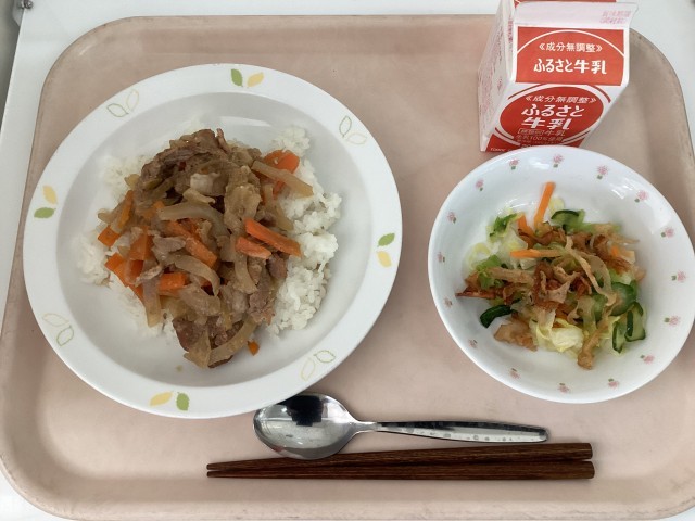 4月17日の給食 公開日 2025/04/21 更新日 2025/04/21 給食 【今日の献立】・豚肉のごまみそ丼・パリパリれんこんサラダ・牛乳【使用した食材の主な産地】にんにく/青森 しょうが/高知 たまねぎ/北海道 にんじん/徳島 キャベツ/神奈川 きゅうり/群馬 れんこん/千葉 給食