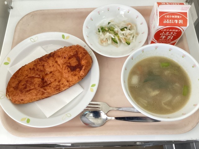 4月22日の給食 公開日 2025/04/23 更新日 2025/04/23 給食 【今日の献立】・ココア揚げパン・肉団子入り春雨スープ・ツナサラダ・牛乳【使用した食材の主な産地】しょうが/高知 ねぎ/千葉 にんじん/徳島 白菜/茨城 こまつな/埼玉 きゅうり/群馬 だいこん/千葉 レモン/広島 給食