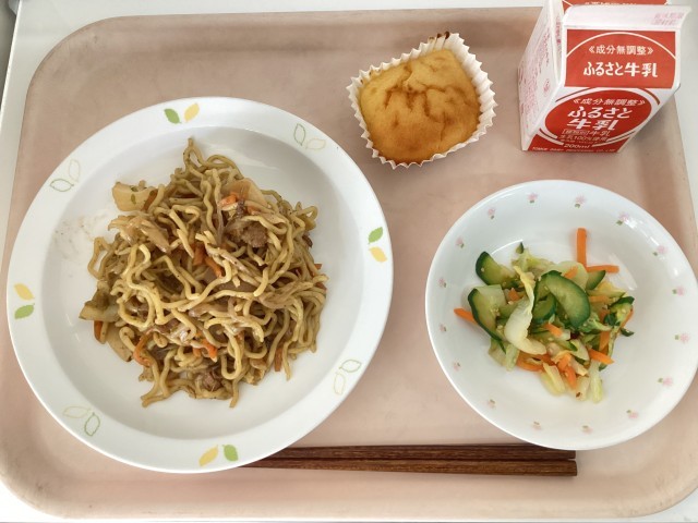 4月23日の給食 公開日 2025/04/23 更新日 2025/04/23 給食 【今日の献立】・ソース焼きそば・野菜の中華風味・ヨーグルトケーキ・牛乳【使用した食材の主な産地】たまねぎ/北海道 にんじん/徳島 キャベツ/神奈川 もやし/栃木 はくさい/茨城 きゅうり/群馬 給食