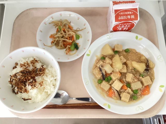 5月1日の給食 公開日 2025/05/01 更新日 2025/05/01 給食 【今日の献立】・ごはん・かみかみ佃煮・新じゃがいものそぼろ煮・もやしのごま風味【使用した食材の主な産地】にんじん/徳島 たまねぎ/北海道 新じゃがいも/鹿児島 もやし/群馬 こまつな/埼玉 給食