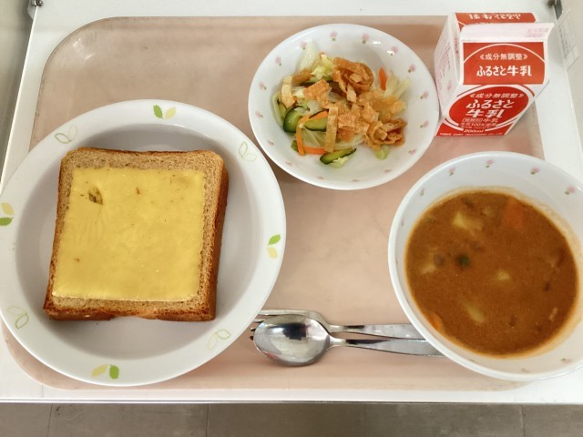5月19日の給食 公開日 2025/05/19 更新日 2025/05/19 給食 【今日の献立】・チーズトースト・ポークシチュー・パリパリサラダ・牛乳【使用した食材の主な産地】たまねぎ/佐賀 にんじん/徳島 じゃがいも/長崎 キャベツ/茨城 きゅうり/埼玉 給食