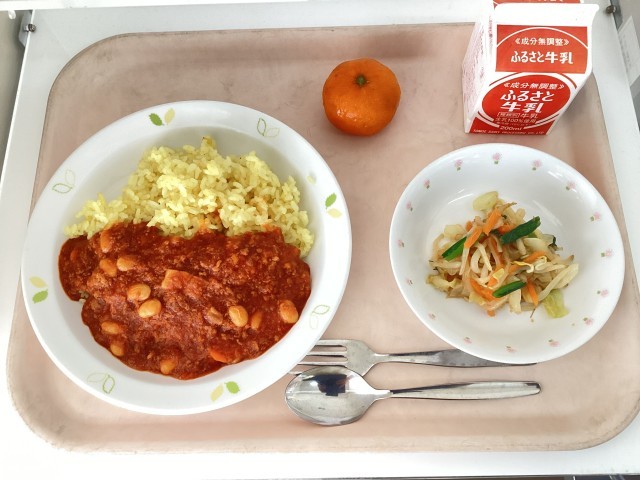 5月29日の給食 公開日 2025/05/29 更新日 2025/05/29 給食 【今日の献立】・チリビーンズライス・野菜サラダ・冷凍みかん・牛乳【使用した食材の主な産地】にんにく/青森 たまねぎ/佐賀 にんじん/徳島 もやし/群馬 キャベツ/茨城 こまつな/埼玉 りんご/青森 給食
