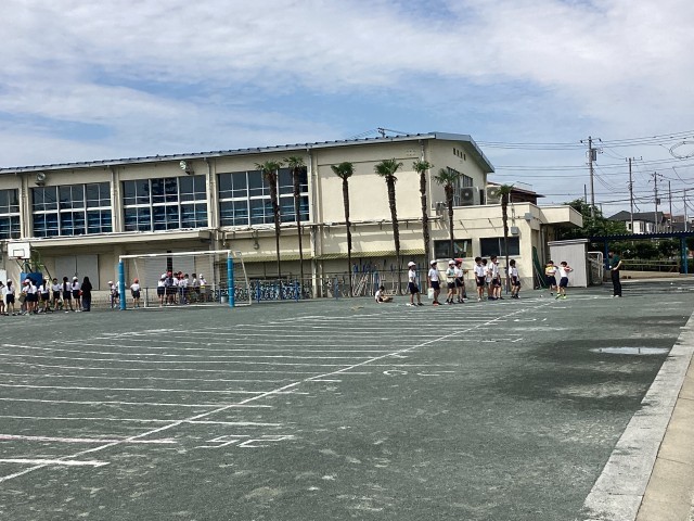 先生がお手本を見せてくれましたが、どのくらい飛んだと思いますか!?(50mまでは1m刻みで白線が引いてました)
