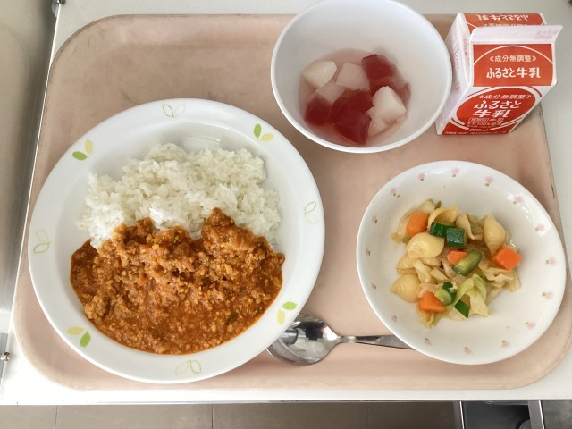 6月17日の給食 公開日 2025/06/17 更新日 2025/06/17 給食 【今日の献立】・ドライカレー・コロコロマカロニサラダ・あじさいゼリー・牛乳【使用した食材の主な産地】にんにく/茨城 しょうが/高知 たまねぎ/佐賀 にんじん/茨城 ピーマン/茨城 キャベツ/茨城 きゅうり/埼玉 りんご/長野 給食