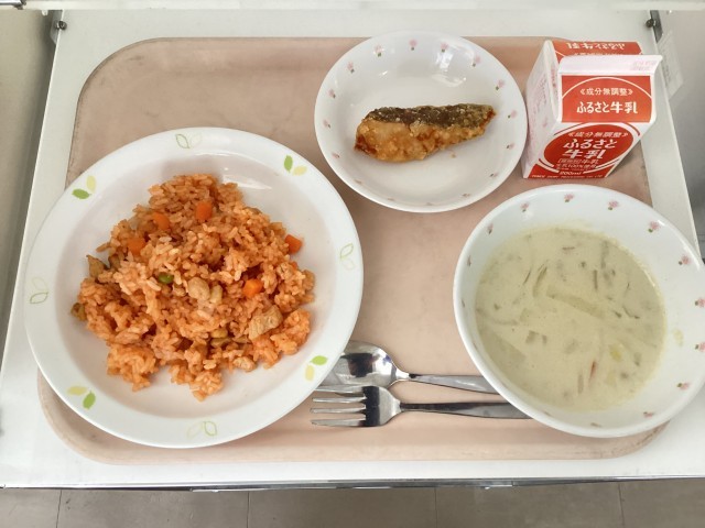 6月30日の給食 公開日 2025/06/30 更新日 2025/06/30 給食 【今日の献立】・チキンライス・白身魚の変わり揚げ・豆乳クリームスープ・牛乳【使用した食材の主な産地】たまねぎ/佐賀 にんじん/千葉 しょうが/高知 にんにく/青森 じゃがいも/長崎 キャベツ/群馬 給食