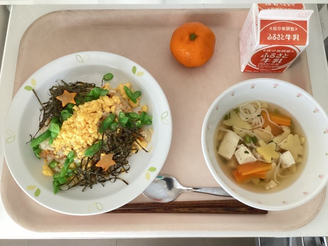 7月7日の給食 公開日 2025/07/07 更新日 2025/07/07 給食 【今日の献立】・天の川ちらしごはん・七夕汁・冷凍みかん・牛乳【使用した食材の主な産地】しょうが/高知 にんじん/千葉 万能ねぎ/福岡 さやいんげん/茨城 冷凍みかん/和歌山 給食