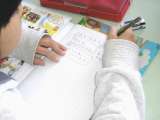 フエルトを切り、クッションの模様を作っていました。(9月13日)