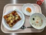 (今日の献立) ・ピザトースト ・サーモンチャウダー ・いよかん ・牛乳...