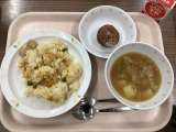 (今日の献立) ・三色ピラフ ・白いんげんの田舎風スープ ・あしたばドーナ...