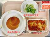 (献立) ・あしたばパン ・ラザニア ・えだまめサラダ ・牛乳 あしたばパンの...