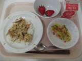 (今日の献立) ・親子丼 ・パリパリれんこんサラダ ・いちご ・牛乳 ...