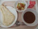 (今日の献立) ・ナン ・キーマカレー ・じゃがいものハニーサラダ ・牛...