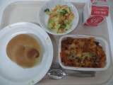(今日の献立) ・あしたばパン ・ラザニア ・フレンチサラダ ・牛乳 ...
