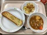 (今日の献立) ・ガーリックトースト ・ビーンズシチュー ・やさいチップス...