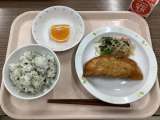 (今日の献立) ・わかめじゃこごはん ・ジャンボぎょうざ ・塩ナムル ・...