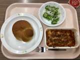 (今日の献立) ・あしたばパン ・ラザニア ・えだまめサラダ ・牛乳 ...