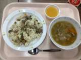 (今日の献立) ・鶏ごぼうピラフ ・白いんげんの田舎風スープ ・つぶつぶみ...