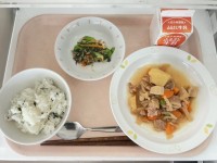【今日の献立】・わかめごはん・肉じゃがのうま煮・野菜ののり和え・牛乳【使用した主な食材の産地】たまねぎ/北海道 にんじん/徳島 じゃがいも/鹿児島 もやし/郡馬 こまつな/埼玉