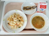 【今日の献立】・たけのこごはん・ししゃものからあげ・豚汁・牛乳【使用した主な食材の産地】にんじん/徳島 さやいんげん/沖縄 ごぼう/青森 だいこん/千葉 じゃがいも/長崎ねぎ/茨城