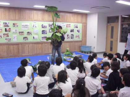 はじめに種を見せて頂きました。そして、種からは想像が出来ないほど大きくなった、大根・人参・ブロッコリー・キャベツ・里芋等を教室に持って来てもらいました。