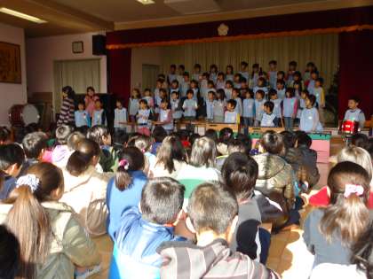 [2012年12月12日(水)] 幼小交流 公開日 2012/12/28 更新日 2012/12/28 5年 1・2学期と交流を進めてきました。 今回は、今までのお礼にと、幼稚園から音楽会を聴きにきてほしいと 招待状が届きました。 リズムを体全体で表現した曲の演奏と 元気いっぱい笑顔いっぱいの歌を聴かせてもらい、 私たち5年生が元気をいただき、温かい気持ちになりました。 給田幼稚園のみんな、ありがとう!! いいね(0)