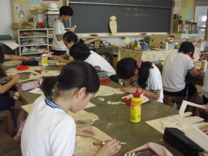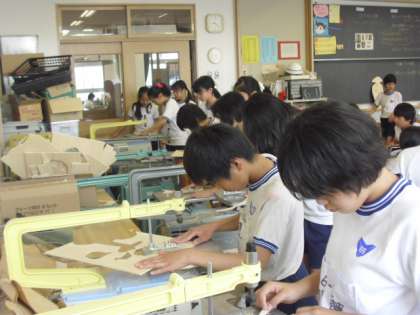 四つ切程度の大きさの合板3枚を使い、装飾的なお面作りに取り組んでいます。電動糸鋸を使って板を切った後は、やすりで丁寧に磨いて、形を整えていきます。手間のかかる作業ですが、根気強く一生懸命な姿が見られ、できあがりが楽しみです。