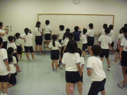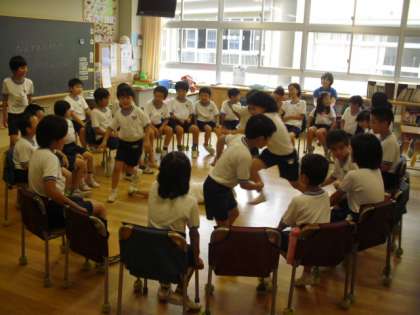 子どもたちは、それぞれの班に分かれて、「いすとりゲーム」「フル−ツバスケット」「続き絵」「震源地ゲーム」「ハンカチ落とし」「宝探し」「ドッチボール」などで楽しく過ごしました。