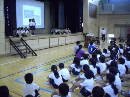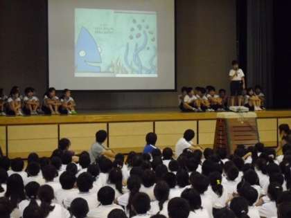 7月2日(火)の朝は、児童集会があり、図書委員会からの発表でした。