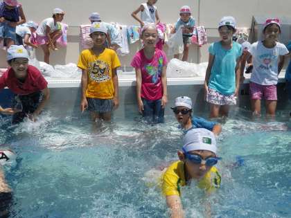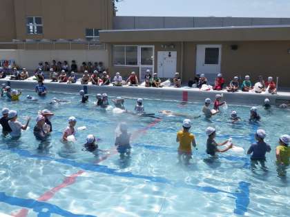 着衣泳とは、水の事故を想定し、衣服を着用したまま水の中で動くことの難しさを体感することです。子どもたちは普段とは違う水の圧力を感じ、泳ぎづらさや、ペットボトルなどを使って浮くことの大切さを学びました。