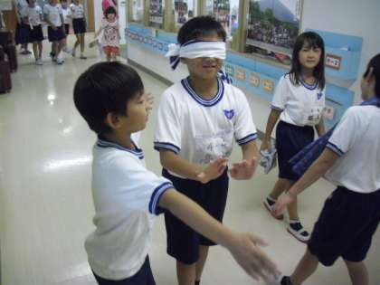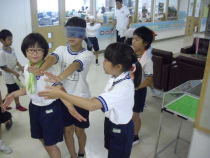 4年生は、総合的な学習の時間をつかって、「しょう害のある方々の理解を深めるため」の体験的な学習で、アイマスク体験を行いました。